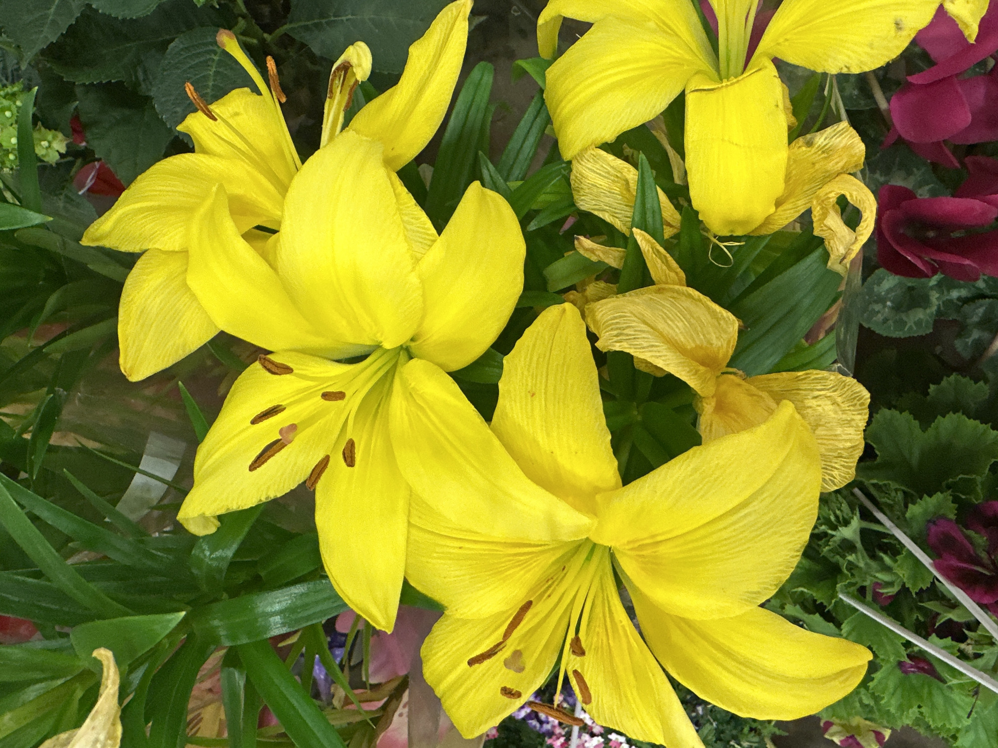 bouquet of yellow lilies with green leaves. Some of the lilies are in full bloom, while others have wilted petals. The scene also includes some burgundy flowers and other green foliage in the background. The location and any information about Esenyurt, Turkey, is not discernible from the image.