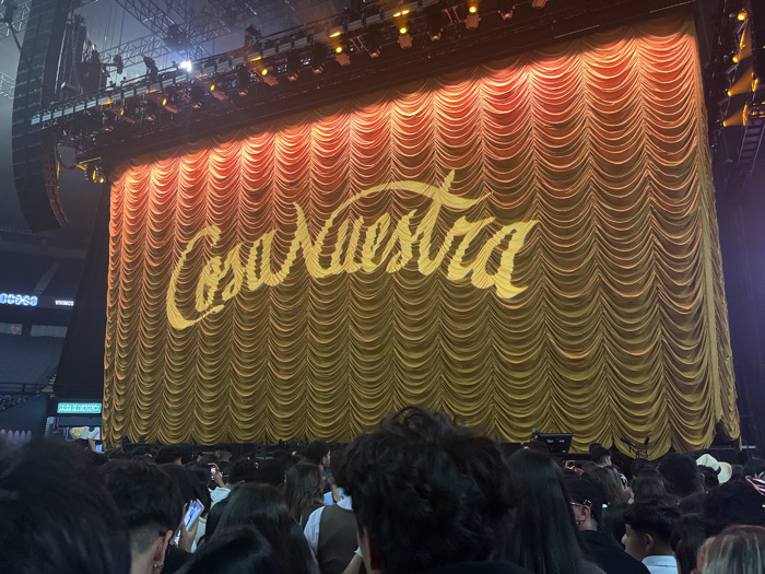 The image depicts an indoor event scene within a large arena, identified as the Estadio GNP Seguros in Mexico City, Mexico, by visible "Estadio" and "Vikings" branding in the background. A large, gold-colored, pleated stage curtain dominates the central and upper portions of the frame, illuminated by overhead stage lights. The words "Cosa Nuestra" are projected in large, yellow, script-style lettering onto the curtain. Above the curtain, a metal truss structure supports multiple stage lighting fixtures. The lower foreground is filled with a dense crowd of attendees, primarily visible from the back of their heads and shoulders. Many individuals in the audience are holding up smartphones, directed towards the stage, indicating photography or video recording.