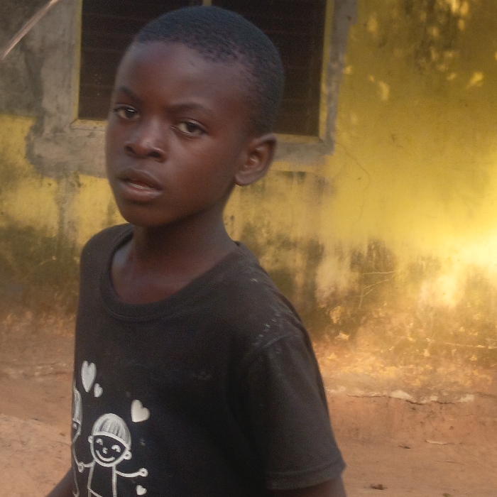 A medium shot depicts a young Black male individual, estimated to be between 5 and 10 years old, standing outdoors in Akwanga, Nigeria