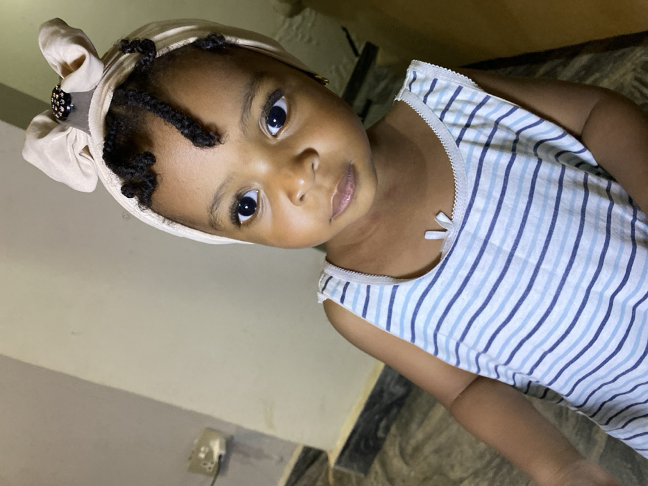 A young girl with dark eyes and a light-tan complexion gazes upward. She wears a light-colored headscarf with a decorative detail at the side and has dark braids with curls framing her face. Her clothing consists of a striped blue and white top with lace and a small bow at the neckline. The background includes a wall with an electrical outlet and patterned flooring.