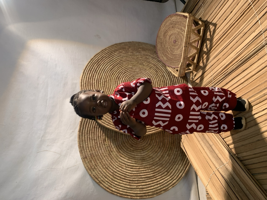 A young child stands centrally, looking directly at the viewer. The child has dark skin and braided hair, wearing a red two-piece outfit with white geometric patterns, consisting of circles and vertical/horizontal lines. Small earrings are visible. The child's hands are held at chest level, holding a small, orange, spherical object. Black closed-toe shoes are worn. The background features a light-colored, textured wall behind two large, circular, spirally woven mats made of natural fiber positioned to the left. To the right, a rectangular woven basket contains another circular woven mat. The floor is covered with a mat made of parallel, light-colored natural fiber strips. The scene is brightly lit, casting subtle shadows on the wall and floor. The location is Barakin Akawo, Nigeria.