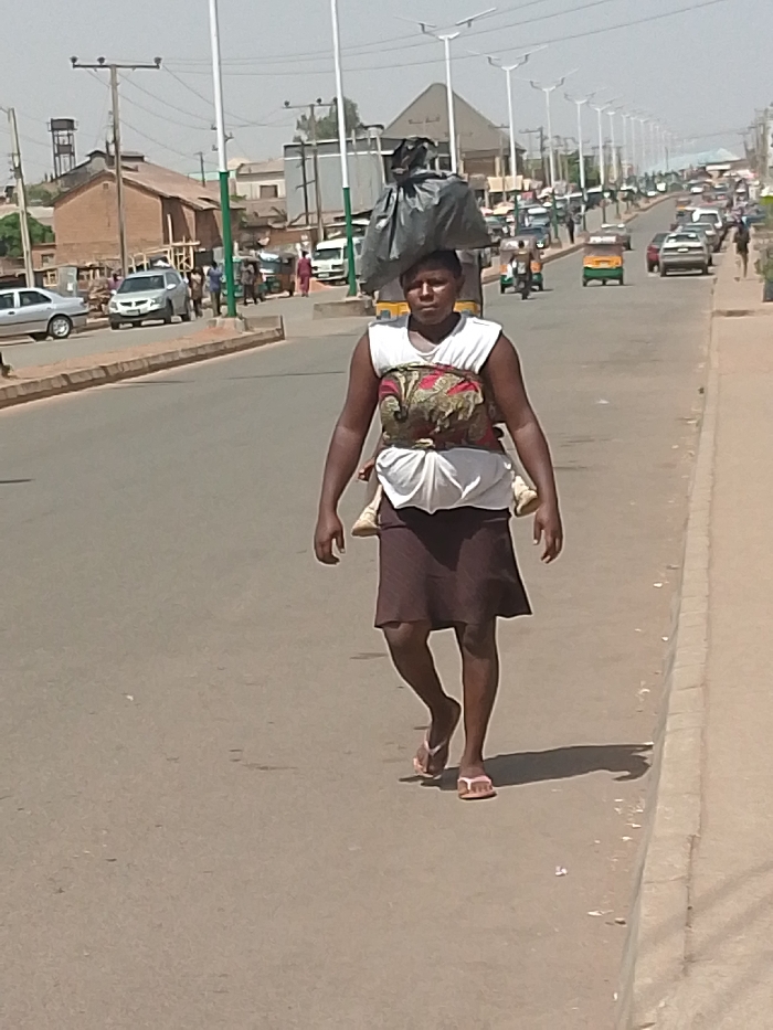 An adult female is depicted walking on a paved road in Bukuru, Nigeria, under a bright, hazy sky