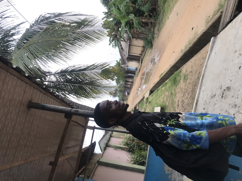 A man in a black shirt with floral-patterned sleeves stands outside, seemingly looking up. The setting appears to be a tropical or subtropical area. A dirt road and a small drainage ditch are visible. Lush green banana trees are present along the road. A low building with a corrugated iron roof is in the foreground. Palm fronds hang overhead, suggesting the presence of palm trees nearby.