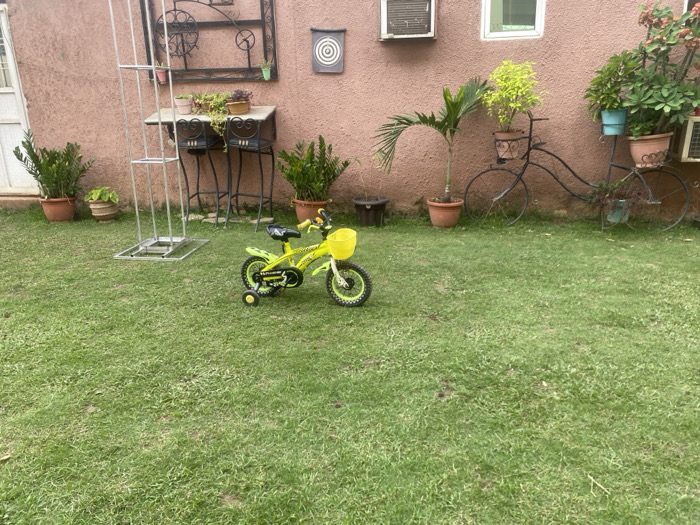 A child's yellow bicycle with training wheels sits on green grass in a backyard. The yard is surrounded by a pink wall with various decorations, including potted plants, an ironwork sculpture, a bar table, and an AC unit. The grass fills the frame and creates a soft, inviting space. The bicycle appears unused, ready for a child to start riding.