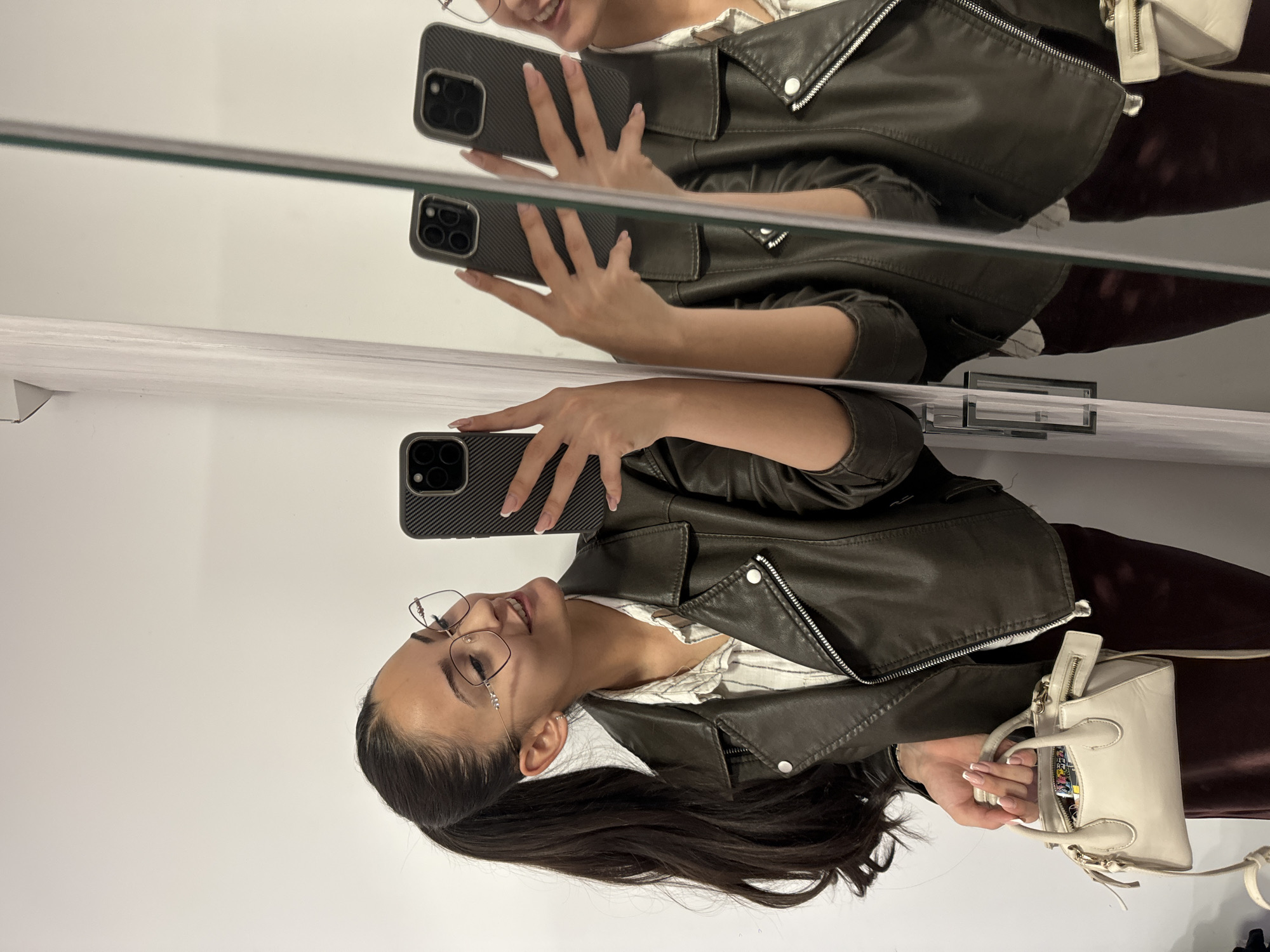 A young woman with brown hair pulled back in a ponytail and wearing glasses is taking a selfie in a mirror. She is wearing a brown leather jacket over a striped shirt and holding a white handbag. The mirror appears to be in a dressing room or retail setting with white walls. There is no indication that the location is in Dupnitsa, Bulgaria.