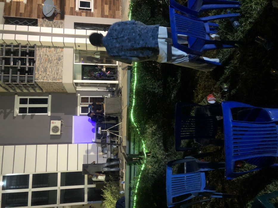 A house stands with multiple windows and architectural details, including a satellite dish. People gather on a porch and inside the house. Outside, a group appears to be performing or setting up equipment, with a screen and sound system visible. String lights snake along a grassy area where blue chairs are scattered. One person walks by the chairs.