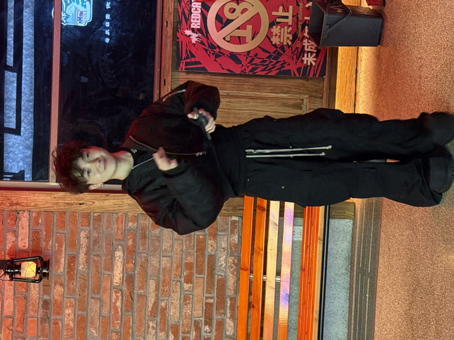 An individual stands smiling in an indoor establishment in Jiangbei, China. The subject, an East Asian person with short, dark, curly hair, is wearing a black cropped puffer jacket with silver zippers, a black long-sleeved shirt, black oversized cargo pants with white drawstrings, and black platform shoes. A silver chain necklace is visible, and an earring is present in the left ear. The subject's right hand is slightly raised and open, while the left hand holds a dark, rectangular object. The background on the left features a reddish-orange brick wall adorned with a hanging black metal lantern that emits an amber light. Below the lantern, a wooden bench with multiple horizontal slats is affixed to the wall, with a white electrical outlet visible underneath. To the right of the subject, a dark wooden structural element is present. Behind the subject's upper body is a large dark window or screen displaying faint, blurred reflections. A prominent red and black poster is visible to the subject's right, featuring the text "REDCAT," a large "18" within a circle and diagonal line (indicating prohibition), and Chinese characters reading "禁止" (Forbidden) and "未成年" (Minors). A dark grey or black plastic bin is positioned on the floor to the right of this poster. The floor surface is a light brown, textured material.
