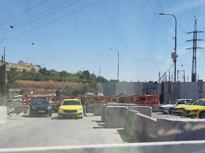 A daytime shot reveals a checkpoint, likely at a border crossing. Several vehicles, including a black car and two distinctive yellow ones, queue to pass. Security personnel are visible. The checkpoint is constructed with concrete barriers and orange metal structures. Power lines with orange markers run overhead. A hillside with vegetation and a few buildings is visible in the background, along with power pylons and streetlights. The sky is clear blue.