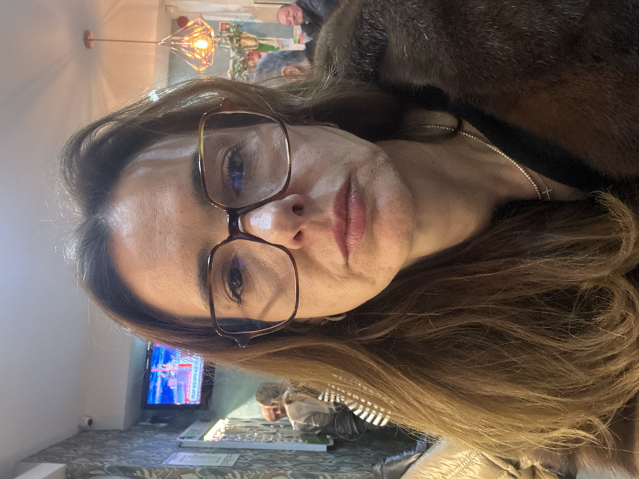 A woman with brown hair, wearing large square glasses, is the focal point. She has fair skin and is wearing lipstick. A fur coat drapes over her shoulders. In the background is a room with a TV showing a breaking news story, a decorative table, a light fixture, and art hanging on the wall. Another person is visible in the background, partially obscured. The photo appears to be taken from a slightly off-center angle.