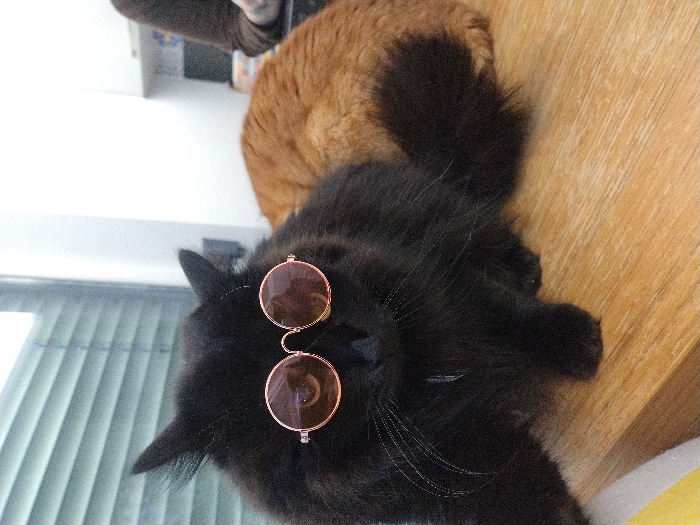 - "A black cat wearing round sunglasses lies on its side on a wooden surface next to an orange cat" by FM-M4lpO2, licensed under CC BY 4.0