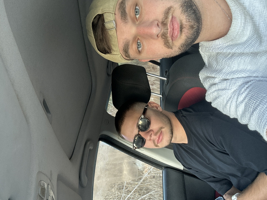 Two males are depicted seated inside a vehicle in Kfar Ruth, Israel, during daytime. The individual on the right, positioned in the foreground, is a light-skinned male with blue eyes, a short beard, and a mustache. He wears a light-colored, textured long-sleeved shirt and a beige baseball cap worn backward, with a silver chain visible around his neck. He is looking directly at the camera. The second individual, seated further back on the left, is a light-skinned male with a buzz cut haircut, a short mustache, and dark sunglasses with brown frames. He wears a black short-sleeved t-shirt and a white watch on his left wrist, looking slightly to the side. The vehicle's interior includes a gray headliner with a visible sunroof, and dark-colored seats, one featuring red trim. Outside the vehicle's left window, a blurry background of bare tree branches or brush is visible.