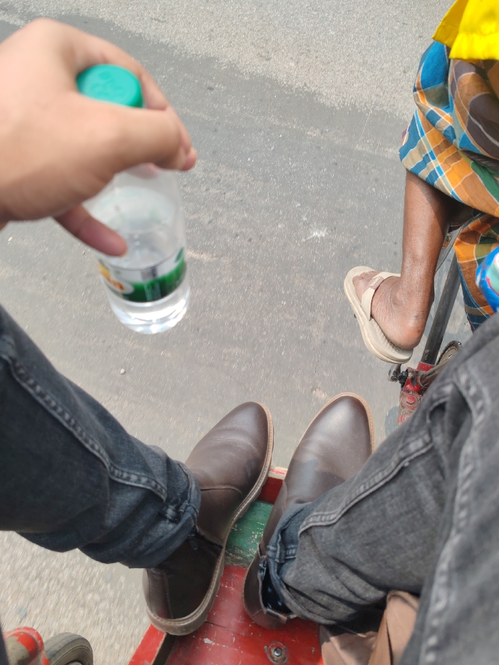 The image captures a first-person, downward-angled view from a passenger on a rickshaw in Dhaka, Bangladesh. In the left foreground, a human right hand holds a clear plastic water bottle with a green cap and a partially visible green and orange label. Below this, the passenger's legs, clad in dark denim jeans, are positioned on a red and green painted wooden footrest, with their feet enclosed in brown leather boots. To the right, the lower right leg of a second individual is visible, wearing a light-colored flip-flop sandal. This individual's attire consists of a blue, brown, and white plaid fabric, with a segment of yellow garment visible at the upper right. A red metal frame and pedal mechanism, consistent with a rickshaw's drivetrain, are partially visible near the second person's foot. The ground beneath the vehicle is a textured grey asphalt or concrete road surface, illuminated by natural daylight.