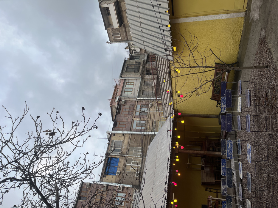 The image depicts an outdoor courtyard in Yerevan, Armenia, under an overcast sky