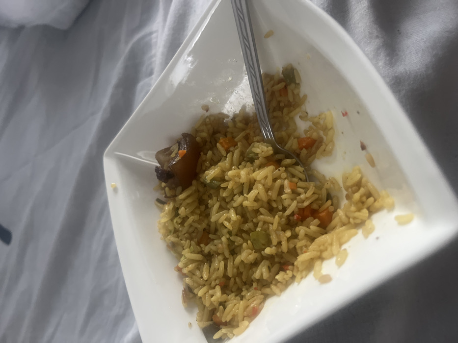 - "An overhead, slightly angled photograph shows a white, square-shaped bowl containing a portion of yellowish-brown rice, consistent with Jollof rice" by FM-pcboy1, licensed under CC BY 4.0