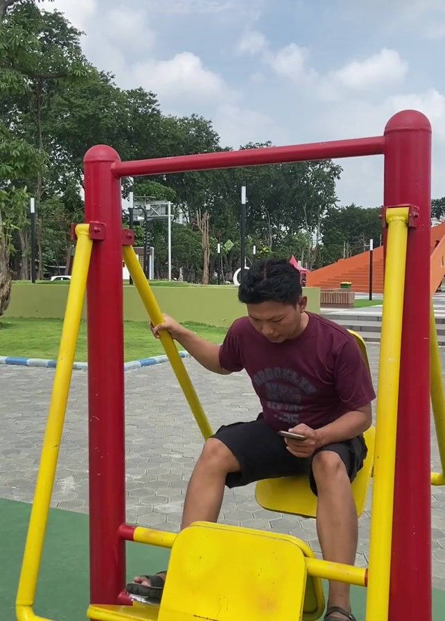 - "A man is sitting on a yellow and red exercise machine in a park" by FM-htxI33, licensed under CC BY 4.0