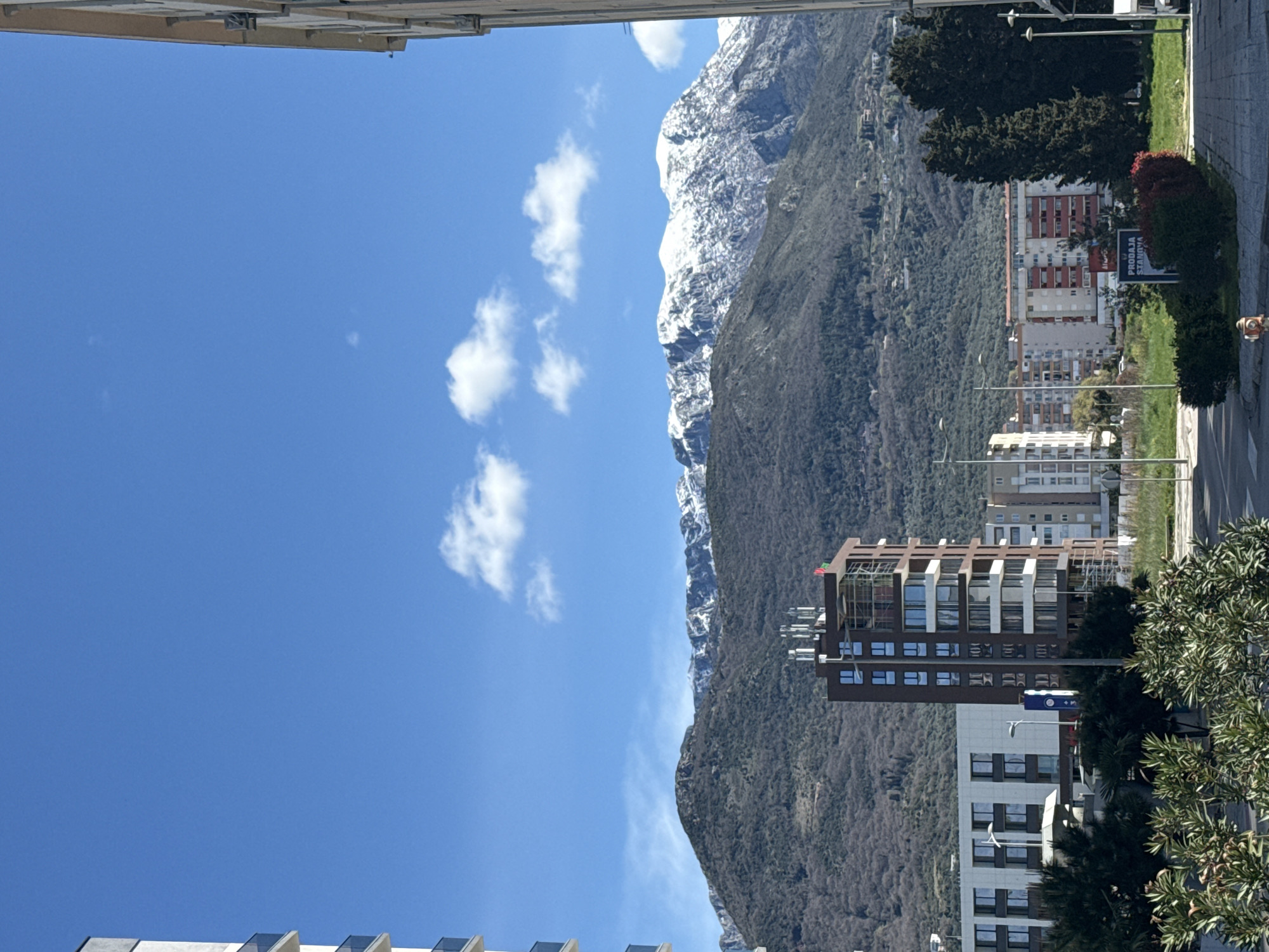 view in Bar, Montenegro. A tall, snow-capped mountain dominates the view on the right. Buildings of varying heights and architectural styles are situated between the mountain and the foreground. A street runs along the right side of the image with trees lining the sidewalk. The sky is blue with scattered white clouds. The picture appears to be taken from an elevated position, potentially from a building. A small sign reading “PRODAJA STANOVA” is visible indicating potential apartments for sale. A fire hydrant is on the side of the street.