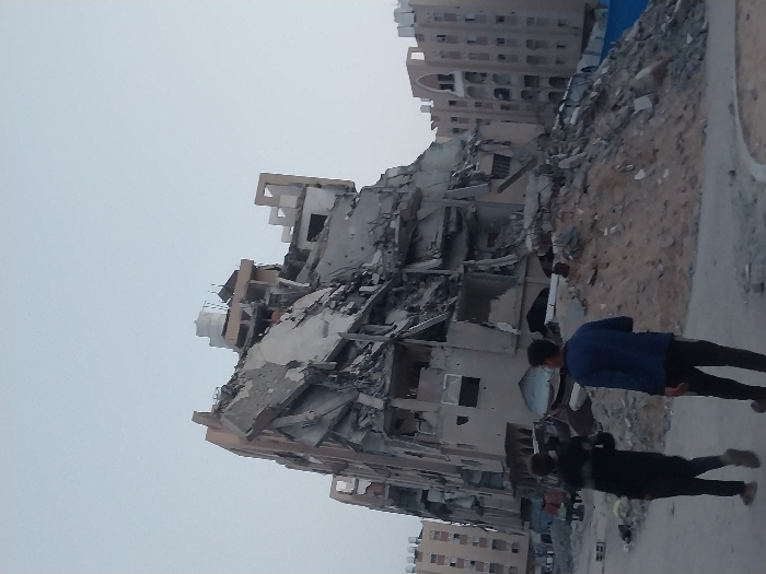 The image displays a scene of significant structural damage in Khan Yunis, Palestinian Territory, under an overcast sky