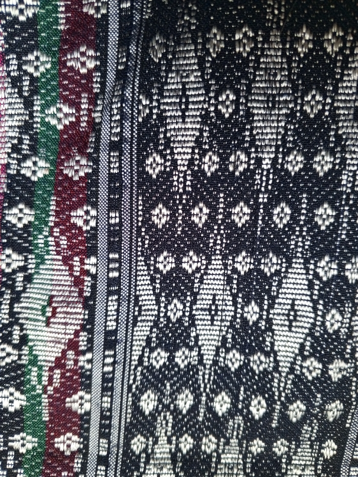 close-up of patterned fabric. A broad band on the left features vertical stripes in white, green, and maroon with small floral-like designs. A thinner, striped band separates it from the main fabric, which displays a repeating diamond-shaped pattern in black and white. The intricate weave and contrasting colors create a textured and visually complex textile.