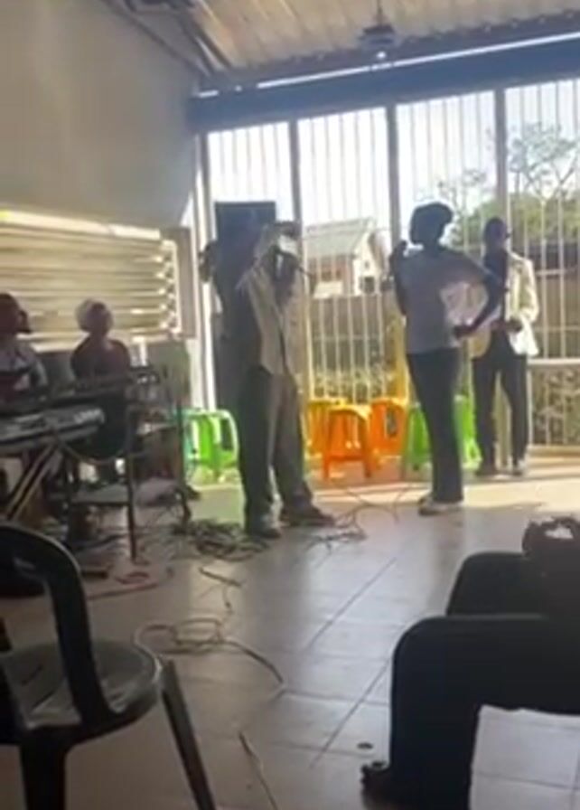 n indoor event with several people. The main focus is on three people standing near large windows with bars, two of whom are holding microphones and appear to be speaking or singing. To the left, there is a person playing a keyboard with another person nearby. There are chairs scattered around, some occupied and some not. Several colorful stools are visible near the windows. The room has a low, simple ceiling and looks like a semi-enclosed space, possibly a veranda or patio. There are electrical cords and equipment spread on the floor.