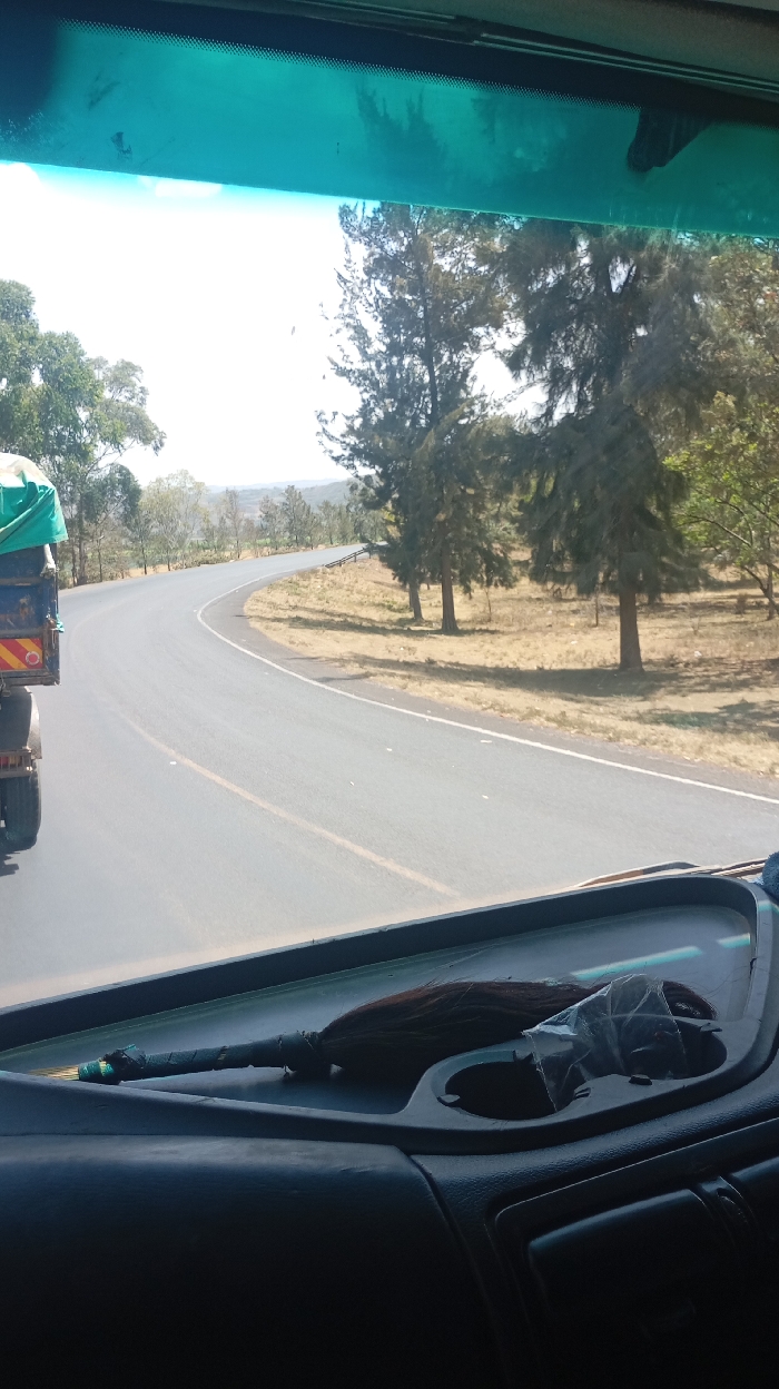 The image depicts a daytime scene observed from the interior of a vehicle on an asphalt road in Viwandani ward, Kenya