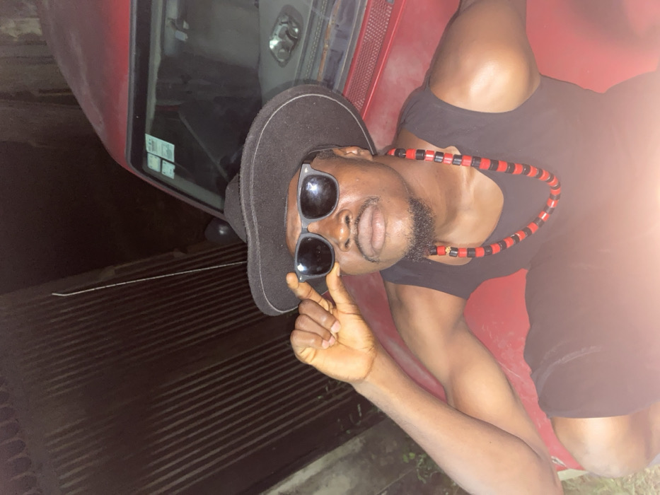 A man poses on a red car hood. He wears a black hat, sunglasses, and a red and black beaded necklace. He holds the sunglasses with his right hand. His top is black, and his skin is dark. The lighting in the image appears dim, with a bright glare on the right side. Part of the car windshield is visible. The background is dark and unclear, possibly suggesting an outdoor location at night.