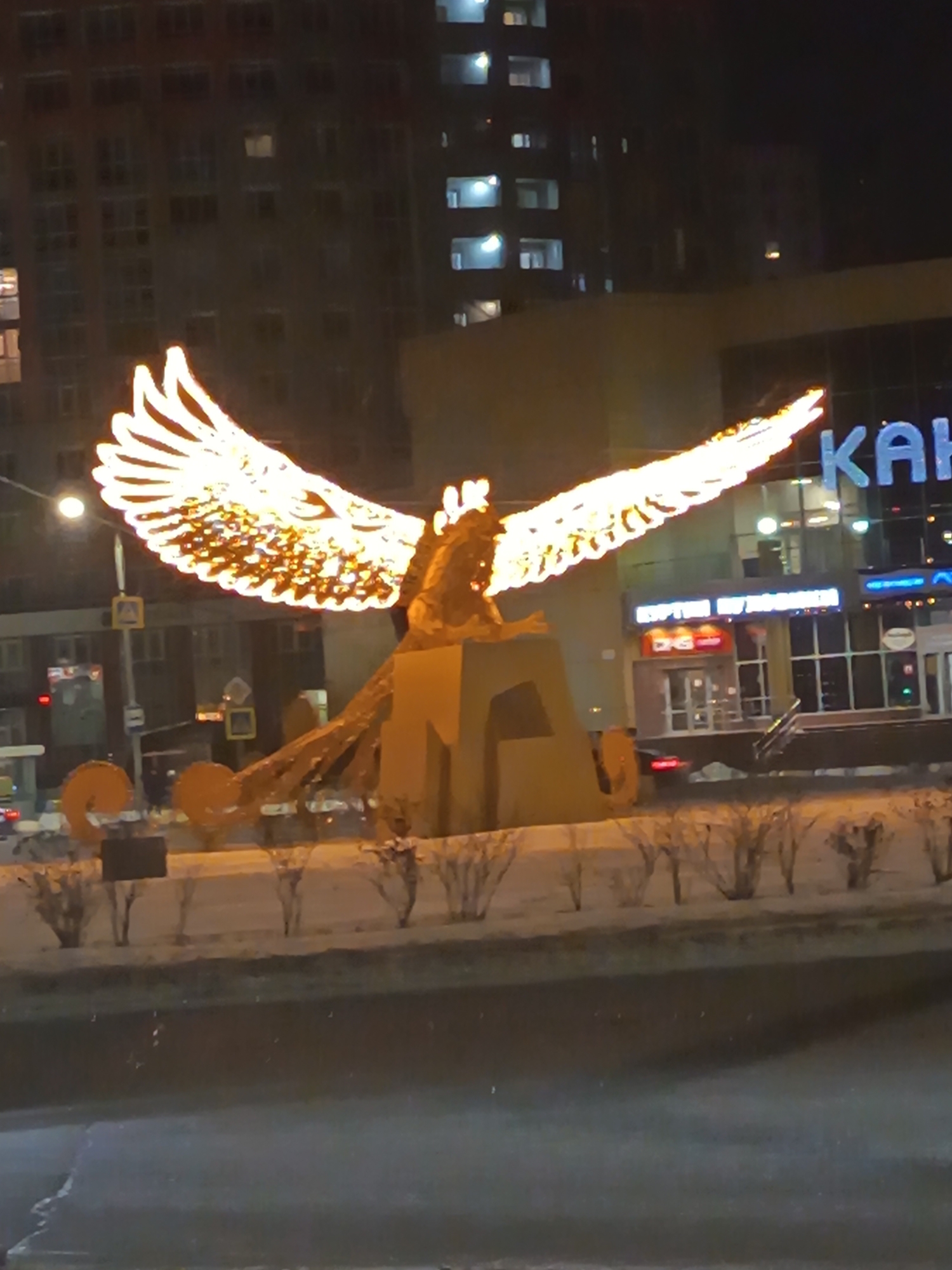 A statue of a griffin with illuminated wings stands in front of a building in Nizhnevartovsk, Russia, at night. The griffin is gold-colored and appears to be made of metal. Its wings are illuminated with bright lights. The building behind the statue has a sign that reads "KAHL" in Cyrillic script. Other storefronts are visible. The street in front of the statue is wet and appears to be a winter scene. Bushes line the median. Taller buildings are in the background.