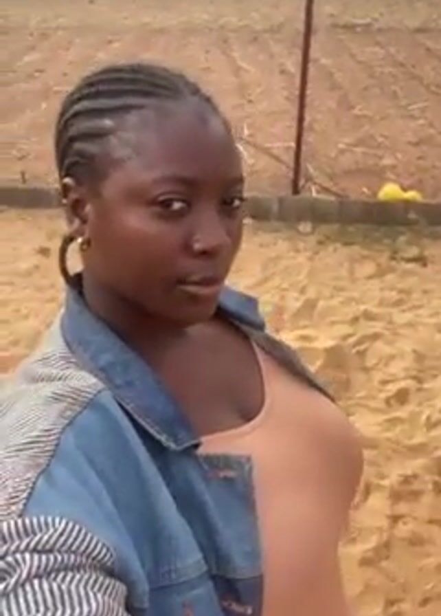 A woman is standing outside, facing the camera, and filming a selfie video. She is wearing a tan-colored top and a denim jacket with a striped sleeve. Her hair is braided, and she is wearing hoop earrings. Behind her is a dirt area with a short metal fence and sparse vegetation in the background. The woman looks at the camera and licks her lips. The sound of a crying baby can be heard.