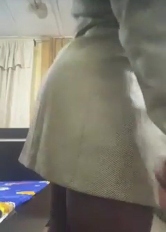 A person with dark skin and long dark hair, dressed in a light-colored blazer dress, is seen from behind in what appears to be a bedroom. The person is wearing gold earrings and has their back to the camera. The room contains a bed with blue and yellow sheets, beige curtains, a ceiling fan, and tiled flooring. The camera remains stationary throughout the short clip.