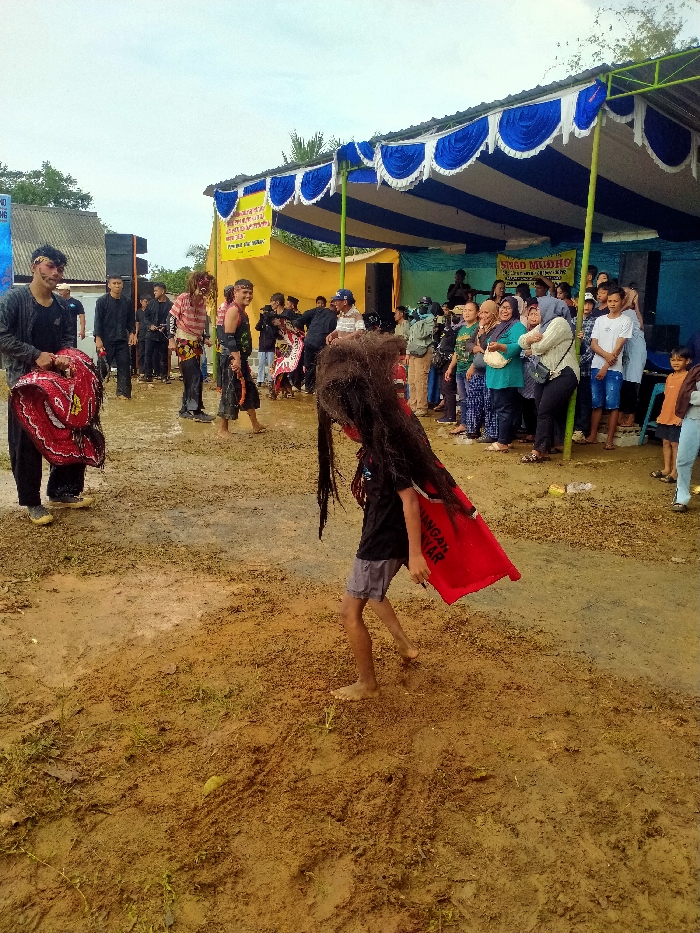 An outdoor cultural event is underway in Ganten, Indonesia, depicted under an overcast sky on a muddy, uneven brown terrain. A temporary tent structure with a blue and white striped canopy and white ruffled valance stands in the mid-ground, supported by green poles. Below the tent, a diverse crowd of onlookers, comprising adults and children in casual attire, observes the scene, with many smiling. A yellow banner with Indonesian text, "SAGU MUDHO," is visible on the tent's rear wall, above dark sound speakers. A blue banner is partially visible on the far left. In the foreground, a young individual, likely a performer, is positioned centrally, barefoot, wearing a black t-shirt and grey shorts. Their face is obscured by long, dark, disheveled hair, possibly a wig. They carry a red fabric item, resembling a cape or banner, with white text "HANGAY...AYAR," and are captured in mid-movement, with one leg lifted, suggesting dancing or active performance in the mud. To the left of the central performer, a man with a dark jacket, dark pants, and a dark headscarf featuring white facial markings stands, holding a red and white decorated fabric prop. Further back and to his right, another individual in traditional attire, possibly masked, wears a striped shirt and dark lower garment. Several other figures in dark traditional clothing are visible in the mid-ground, some near the speakers. The muddy ground, marked by footprints and slight depressions, indicates recent wet conditions.