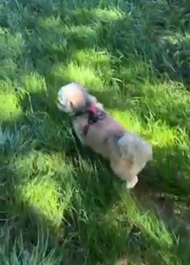 small tan and white dog wearing a red harness walking through a grassy field on a sunny day. The field is partially shaded, and there are trees in the background. The sky is blue. The dog is walking away from the camera.