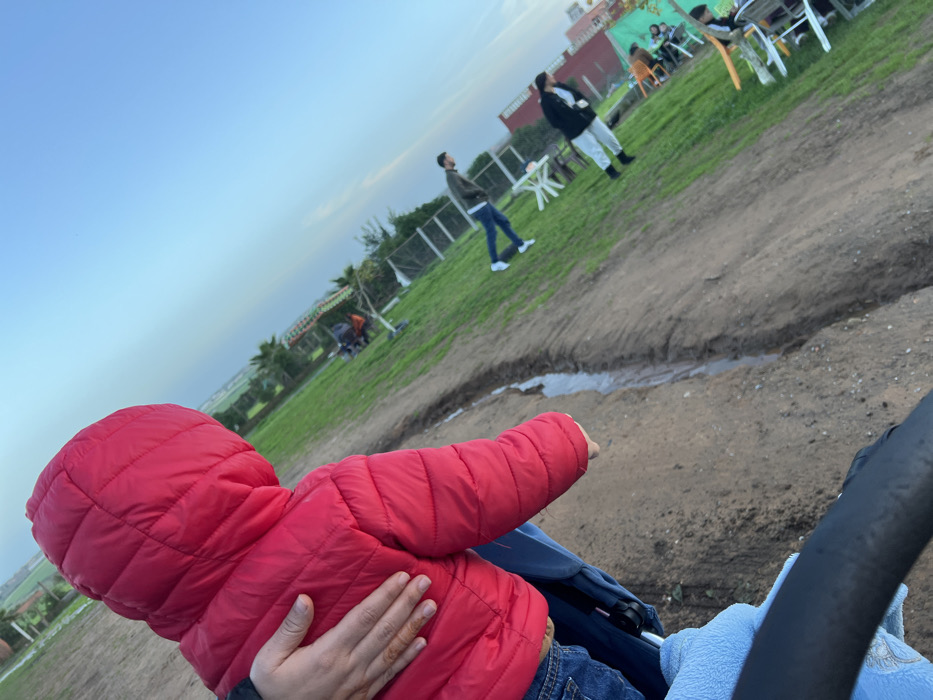 A child in a red puffer jacket is seated in a stroller. A hand rests protectively on their back. The stroller faces a grassy area where people are standing and sitting. A small stream of water cuts through the dirt path in front of the stroller. The sky is clear and blue, providing a bright backdrop to the scene.