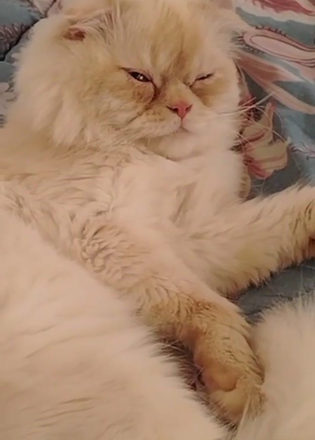 fluffy, light-colored cat lying on a floral patterned bedspread. The cat's fur appears to be predominantly cream or light beige with some slightly darker shading. It has a pink nose and seems to be in a relaxed or sleepy state, with one eye partially closed. The cat's paws are visible, with soft, pink paw pads. The bedspread features a mix of blue and pink floral patterns. The camera is positioned above the cat, offering a close-up view.