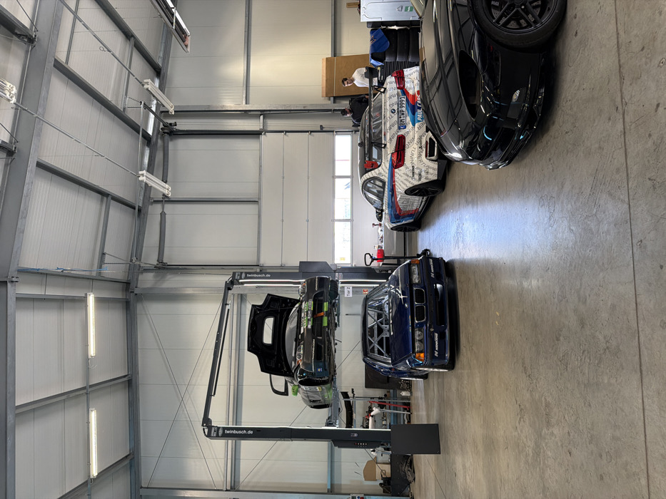 The image displays an interior view of a commercial automotive workshop located in Meuspath, Germany. The facility features an industrial design with high ceilings, exposed metal structural elements, and a light-colored corrugated metal roof. Overhead, multiple linear fluorescent light fixtures provide illumination. The floor is composed of grey concrete. In the left-center, a black "Twinbusch.de" branded two-post car lift is elevated, holding a dark green and black race car, resembling a BMW M3 E46 GTR, with its hood open and the engine bay exposed. Directly beneath the elevated vehicle, a dark blue BMW E36-series sedan, extensively modified for racing with a visible internal roll cage, is parked on the floor. To the right, a white BMW M3 (F80-series) race car with prominent blue, red, and black livery, including "TUNING" and "PAUL CARE" branding, is parked facing away from the viewer. Its rear displays a large aerodynamic wing and diffuser, and a German license plate "BM:WP 9991" is affixed. Two adult males are visible near this vehicle; one in a dark shirt, the other in a white long-sleeved shirt, appearing to be observing or interacting with the car or its immediate surroundings. Behind them, a stack of black tires and other workshop equipment are visible. In the lower right foreground, the front portion of a black sports car, consistent with a Chevrolet Corvette (C5 or C6 generation) due to its distinct headlight design and low-slung fascia, is partially visible. The background wall features horizontal windows and sections of large overhead garage doors, suggesting multiple entry points. The scene depicts a functional environment for high-performance automotive maintenance and preparation.