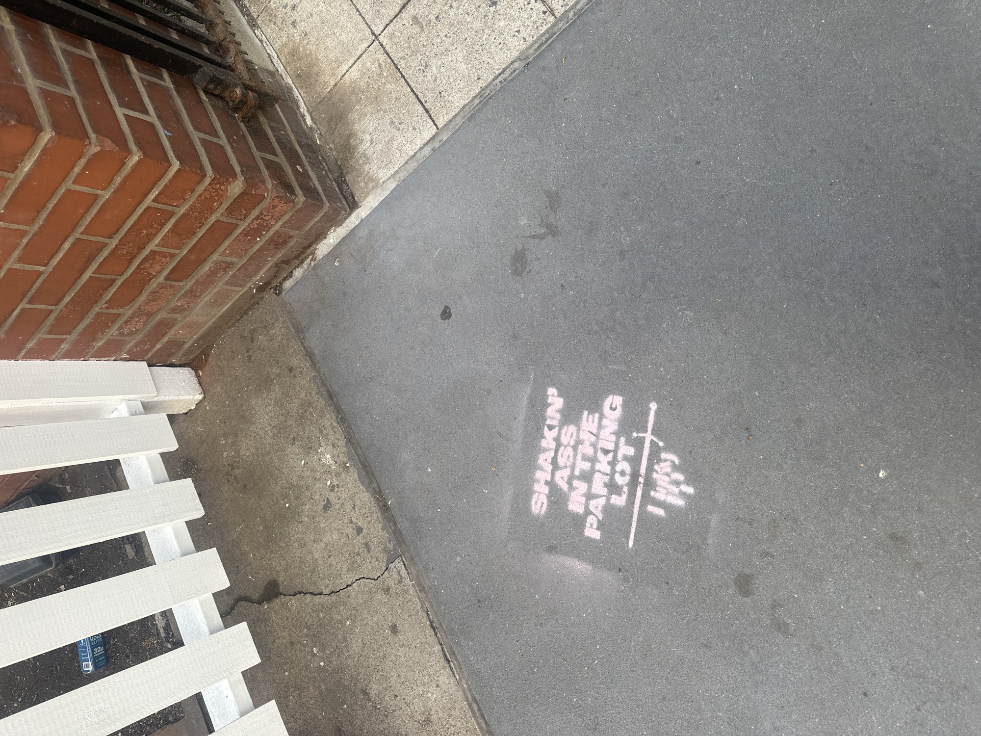 section of sidewalk in an urban area, possibly New York City, United States of America. The sidewalk is gray and has a stencil sprayed in pink paint that reads "SHAKIN' ASS IN THE PARKING LOT" with a crudely drawn diagram next to it. To the left of the sidewalk is a section of brick wall, a white picket fence, and a concrete border. The sidewalk adjoins a different type of concrete or stone surface on the right. The environment appears to be outdoors. No people are visible in the frame.