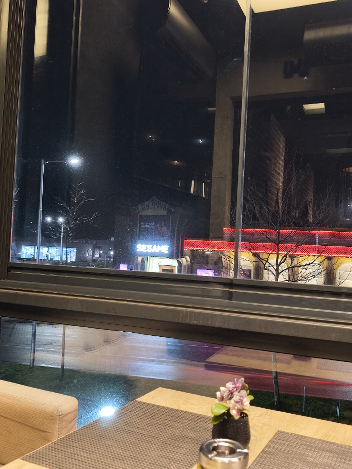 The image presents a nighttime scene viewed from inside an establishment, looking out through a large window onto an urban street. In the foreground, a light-colored wooden table is partially covered by a dark grey woven placemat. On the table, a small black textured vase holds artificial purple and white flowers. Adjacent to the vase, a circular silver metal ashtray is present. To the left, a section of a beige upholstered couch or bench is visible. Reflections of the interior, including dark ceilings/walls and a black air conditioning vent, are visible in the window glass. Beyond the window, a wet, multi-lane street is visible, illuminated by streetlights. Bare tree branches are discernible in the middle ground. Streaks of red light on the road indicate the movement of vehicles. Across the street, the prominent feature is the building housing the "SESAME" casino, identifiable by its illuminated white "SESAME" sign. Above this sign, another illuminated sign with Cyrillic text, "ПЪТЕЧНА КАМПАНИЯ," is present. The casino building features a distinctive red illuminated canopy or trim above its main facade. Additional illuminated building facades are visible further to the left. This scene is located in Burgas, Bulgaria, specifically observing the "SESAME" casino situated at ul. "Aleko Bogoridi" 49, 8000 Burgas Center. No individuals are visible in the frame.