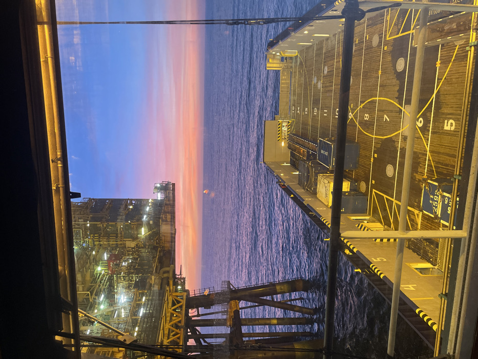 An elevated, outward-looking view captures an offshore industrial scene at twilight, with the city location specified as Unknown, Unknown