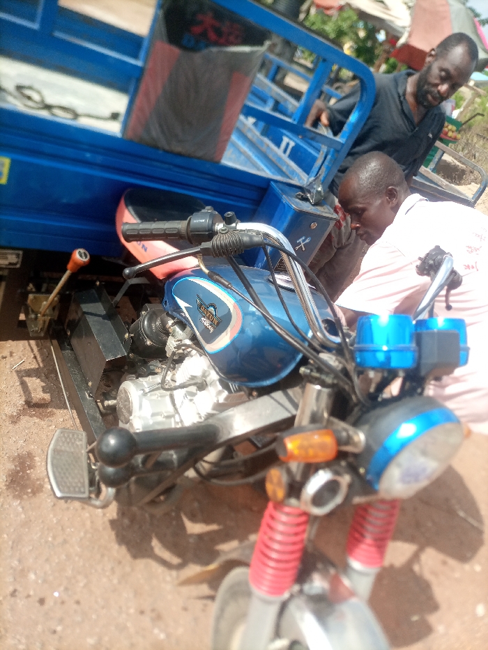 The scene depicts an outdoor setting in Unknown, Unknown, on unpaved reddish-brown ground, illuminated by bright daylight. The primary subject is a blue three-wheeled cargo motorcycle, commonly known as a tricycle or motorella. The front section consists of a blue motorcycle with a fuel tank displaying a "BOYUN" logo. Visible components include handlebars with black grips, an exposed engine, a black frame, a footpeg, red front suspension springs, a blue headlight casing, and amber turn signals. Two blue cylindrical containers are mounted above the headlight. Attached behind the motorcycle engine is a blue metal cargo bed containing a black object with red stripes, possibly a cushioned item or covered cargo. A prominent orange gear lever is located on the left side of the vehicle's frame. Two adult males are present. One male, with a dark complexion and a bald or closely shaved head, wears a light-colored, possibly pink or light brown, striped polo shirt. He is leaning over the motorcycle's engine area, appearing to examine or work on it, with his right hand positioned near the engine. Behind him and the cargo bed, a second male with a dark complexion and a short dark beard wears a dark short-sleeved collared shirt. He stands observing the first male and the motorcycle, with his right hand resting on the cargo bed structure. The background is blurred, showing faint indications of distant structures or vegetation.