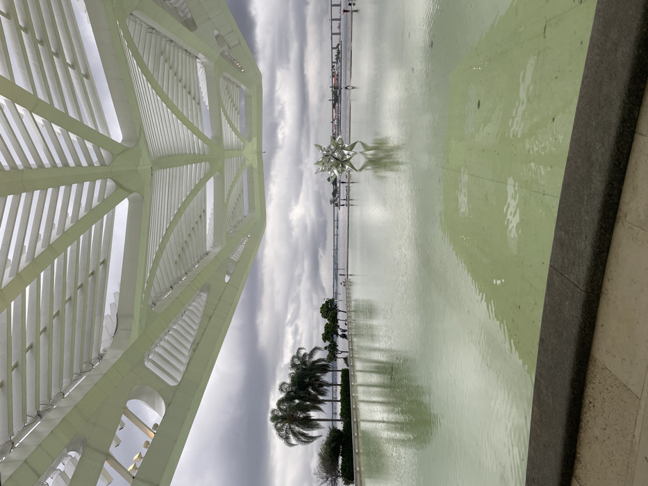 An abstract architectural structure with white beams is positioned on the left side of the frame, contrasting against a cloudy sky. To the right, a shallow body of water reflects the sky and an ornate metal sculpture placed within it. Palm trees line the shore in the distance, their silhouettes adding depth to the scene. The edge of a concrete or stone structure forms the right border, suggesting a designed landscape.