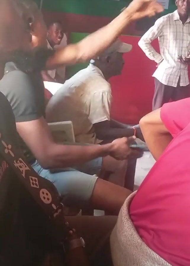 The video captures an indoor scene with a small group of people gathered in what appears to be a casual setting, possibly a betting shop or a community space, given the multiple television screens on the wall. One man stands towards the back of the room wearing a checkered shirt and brown trousers, holding an object that seems to be a small electronic device or a card. Seated in the foreground are several men, one wearing a black shirt with a pattern and light blue shorts, another in a pink shirt, and an older man wearing a cap. There is also a younger man wearing a white shirt seated in the background. The man in the black shirt gestures and speaks, seeming animated in conversation, while the others look on. The environment has a red and green color scheme with television screens displaying various content, possibly sports scores or news.