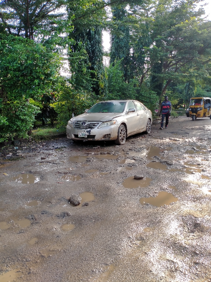 - "The image depicts a damaged, unpaved or heavily degraded asphalt road with numerous mud-filled potholes and loose rocks, located in Gwarinpa, Nigeria" by FM-e0cFx1, licensed under CC BY 4.0