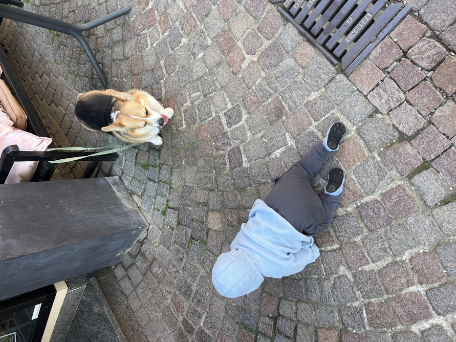 An overhead view depicts an outdoor scene on a cobblestone pavement in Meisenheim, Germany. A young child, dressed in a light blue hooded sweatshirt and dark grey pants, lies prone on the multi-colored cobblestones, facing away from the viewer. Their head is positioned towards the upper left, out of frame, while their legs and torso are visible, with dark shoes worn over light socks. To the upper right of the child, a tri-color Welsh Corgi dog stands on all fours, facing towards the lower left. The dog has its tongue slightly extended, appearing to lick its snout, and a light green leash is attached to its collar, extending towards a dark grey planter on the left. Behind the dog, elements of outdoor cafe furniture are visible, including a black metal table with a single leg and a black metal bench with a light pink cushion. In the lower right foreground, a metal drain grate with parallel bars is present, displaying the text "DIN 19594".