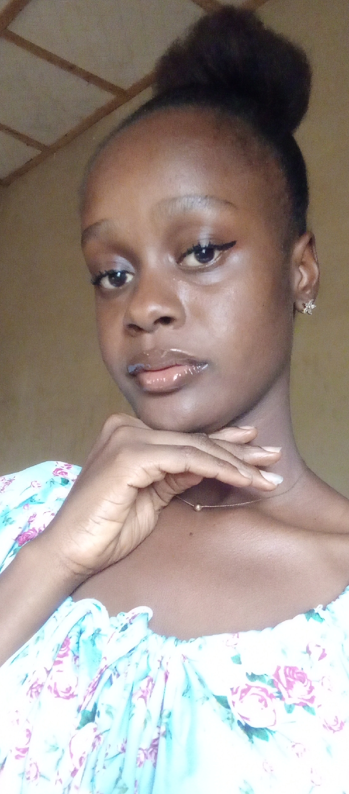 A young woman with a dark complexion, sporting a high bun hairstyle and a subtle winged eyeliner, gazes towards the camera. Her hand gently supports her chin, showcasing manicured nails. She wears a light blue floral top and a delicate gold necklace. Flower-shaped earrings adorn her ears. Her lips are glossy. The background is a simple, light brown wall.