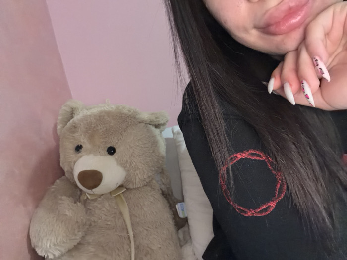 The image depicts an indoor scene with a partial view of an individual alongside a large plush teddy bear. The specific location in Vidin, Bulgaria, cannot be determined from the visual information provided. The individual, visible from the nose down on the right side of the frame, has long, dark hair. Their mouth shows full lips, and their right hand is positioned near their chin. This hand displays long, pointed fingernails, predominantly white with pink and black leopard print patterns on some nails. The individual wears a black long-sleeved garment featuring a circular, red embroidered design, resembling a knotted or braided pattern, on the sleeve. To the left of the individual is a light brown plush teddy bear. It has black eyes, a light brown snout, and a light yellow ribbon tied in a bow around its neck. The background consists of a solid light pink wall on the left side, and a white or light-colored pillow or bedding item is partially visible behind the teddy bear on the right. The lighting appears consistent with an interior setting.
