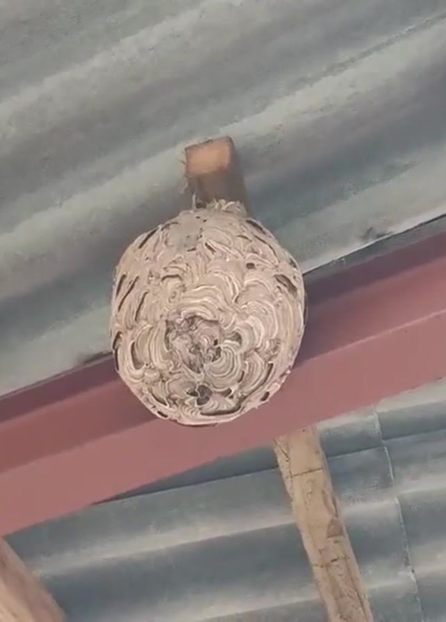 - "large, spherical wasp nest hanging from the ceiling of a covered structure" by FM-QgOmd2, licensed under CC BY 4.0