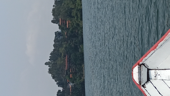 The image presents a scene from a body of water in Bwishyura, Rwanda, with a populated hillside in the background. In the foreground, the weathered white bow of a wooden boat is visible, featuring a distinct red trim along its top edge, suggesting the vantage point is from aboard the vessel. The midground is dominated by the expansive surface of the lake, displaying a deep blue-grey hue with gentle ripples. In the background, a large, lush green hill rises from the opposite shore, densely covered with trees and varied vegetation. Multiple multi-story buildings with prominent orange-red tiled roofs are interspersed among the trees on the hillside. The sky above is a uniform, light grey, indicating an overcast or hazy atmospheric condition.