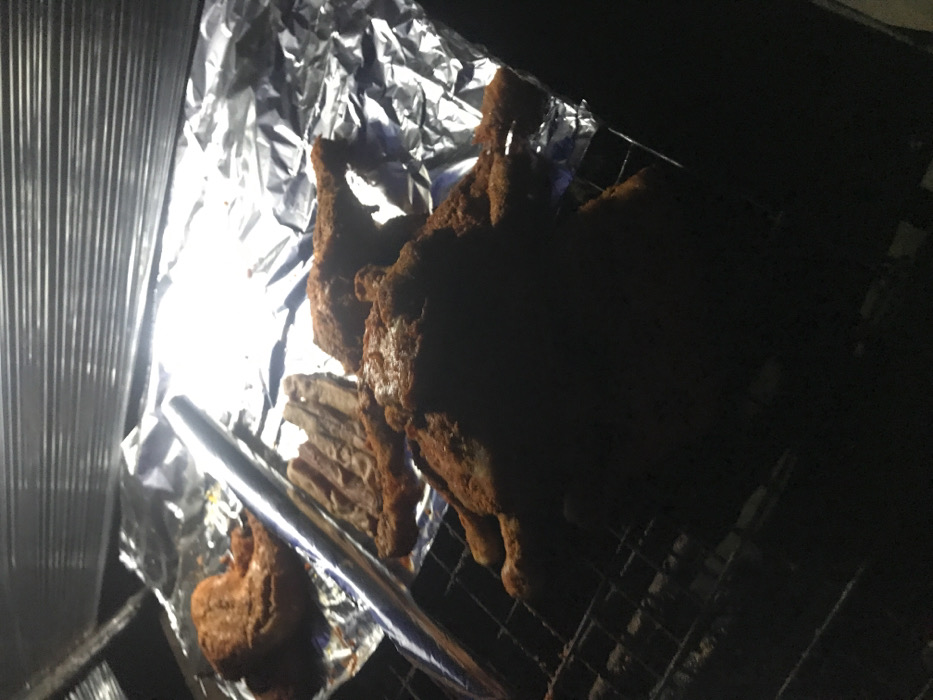 - "On a metal rack placed on aluminum foil, fried chicken pieces are arranged" by FM-GxsWw1, licensed under CC BY 4.0