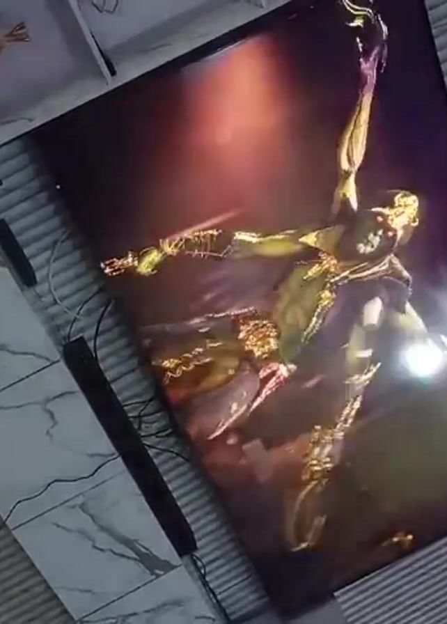 A television screen displays video game footage of characters engaged in combat within a fantastical setting. The TV is mounted on a wall with white and gray tile. To the side of the TV is a decorative shelf with a small, gold-colored object. Below the TV is a soundbar. The video is shot from a slightly angled perspective.