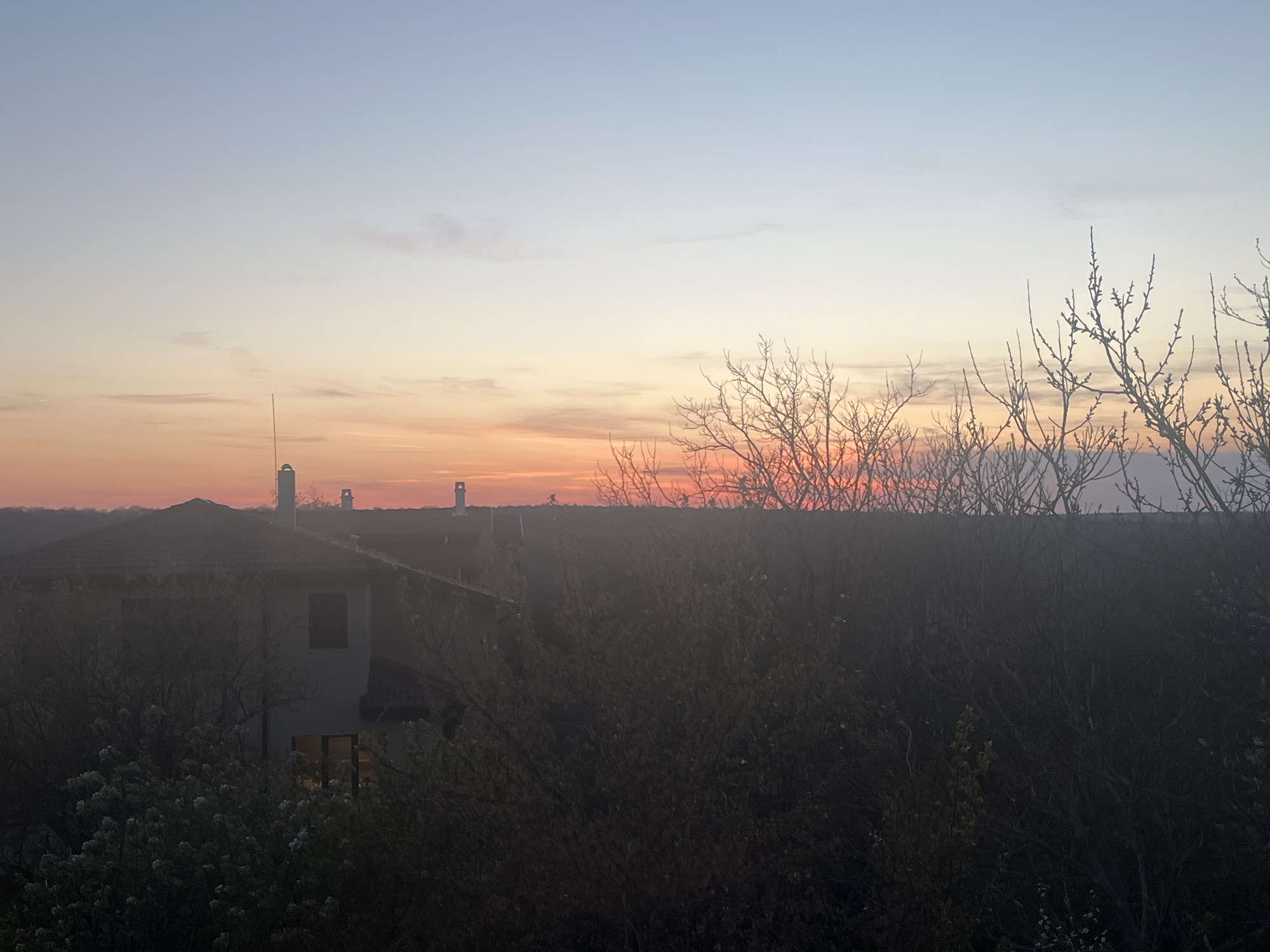 The image, likely taken at twilight in Oreshak, Bulgaria, shows a building with a dark roof and a light-colored exterior partially obscured by dense shrubs and trees. Windows are visible in the building, with light emanating from at least one of them. Behind the building, the horizon is illuminated by a reddish-orange glow, likely from the setting or rising sun. Bare tree branches are silhouetted against the sky. The sky transitions from a pale orange near the horizon to a light blue above. Three cylindrical objects are visible on the skyline, possibly chimneys. There is what appears to be a thin antenna to the left of the house.