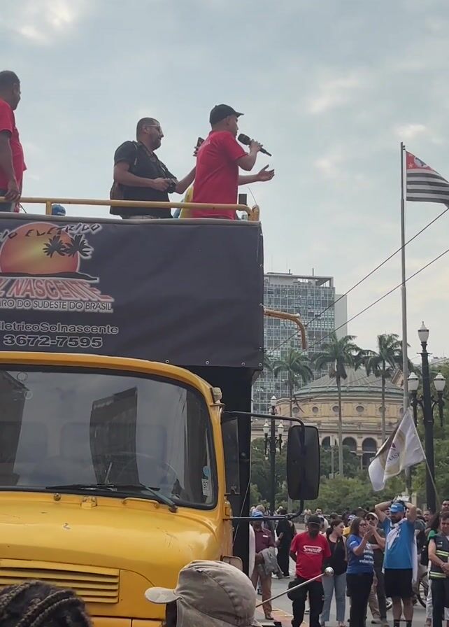The camera pans to a crowd of people gathered on a street in what appears to be a city. The focus is on a yellow truck with a banner that reads in Portuguese, “Trio Elétrico Sol Nascente.” Three men stand on top of the truck; one of them is speaking into a microphone, gesturing with his hand. Another man is holding a camera, seemingly recording the event. The crowd is diverse, with people of varying ages and ethnicities. Many are wearing t-shirts that suggest they are part of the same organization or movement. Some are holding signs and flags. There is a drum band playing. The street has buildings on either side, with trees and streetlights lining the sidewalks. The overall atmosphere is that of a public gathering, potentially a protest or rally.