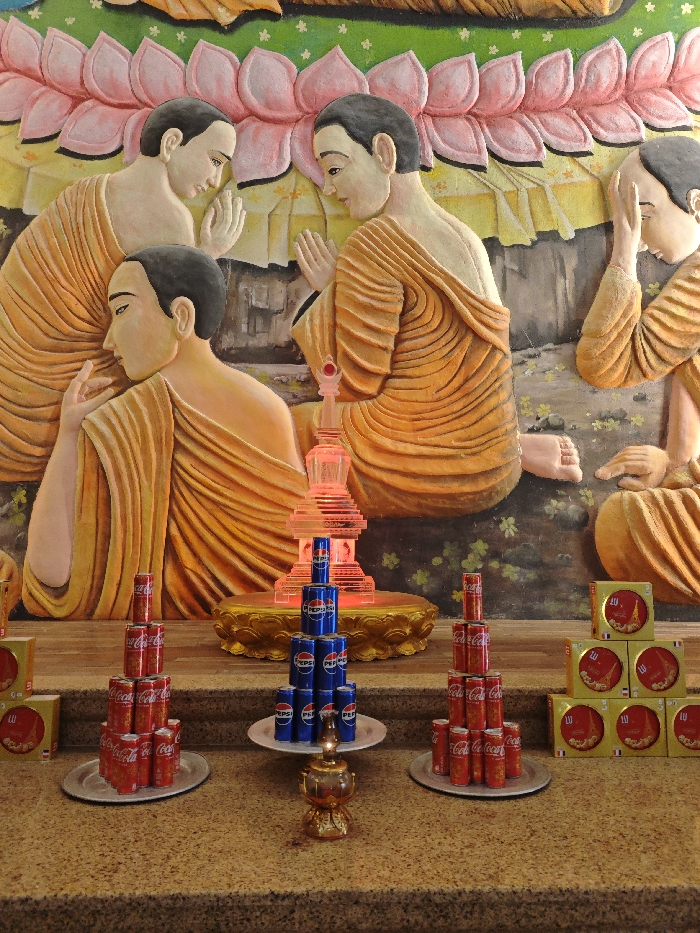 The image depicts the interior of a Buddhist temple or pagoda in an unknown city in Vietnam, showcasing an altar with offerings positioned before a large relief mural. The background mural features multiple bald male figures, likely monks, wearing textured orange robes and depicted in contemplative or prayerful stances, with several shown in the Anjali Mudra (hands pressed together). Pink lotus flower motifs are visible along the top of the mural, with a muted green and blue landscape forming the backdrop. On a speckled, light brown altar surface in the foreground, various offerings are arranged. Centrally, a glowing, translucent pink tiered structure, resembling a stupa or pagoda, rests on a golden circular pedestal. Below this, a pyramid of nine blue Pepsi cans is meticulously stacked on a white plate. To the immediate left and right, two identical pyramids of red Coca-Cola cans, each consisting of at least nine cans, are arranged on silver plates. In the center foreground, a small, ornate golden oil lamp or censer emits a visible flame. To the far right, three yellow and red boxes, possibly containing biscuits and bearing "LU" branding, are stacked in a pyramid formation. No live individuals are present in the immediate foreground.